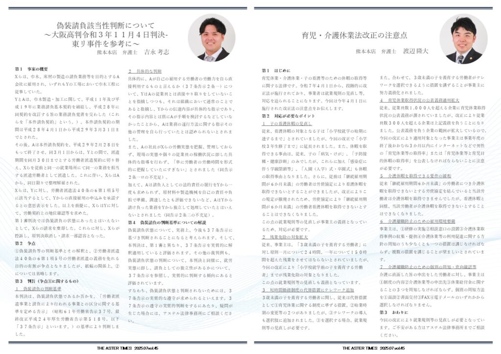 すなわち、偽装請負状態と判断されないためには、37条告示の実質的な遵守が求められるといえます。37条告示の遵守の実質的判断をするにあたり、疑問が生じた場合には、アステル法律事務所にご相談ください。
