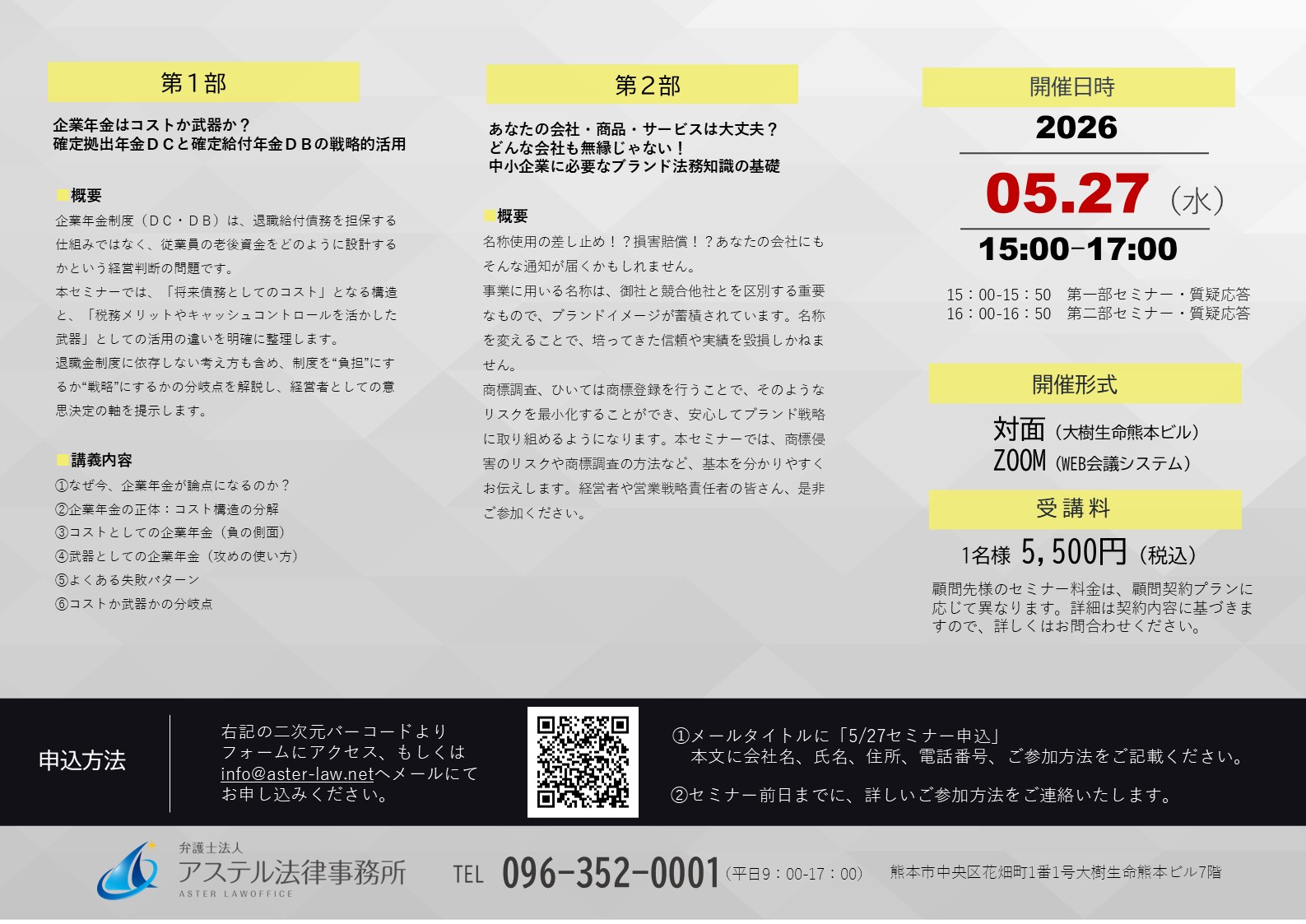 | 日 時 | 2026年5月27日(水)15:00-15:50 第一部セミナー・質疑応答 16:00-16:50 第二部セミナー・質疑応答 |